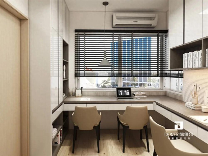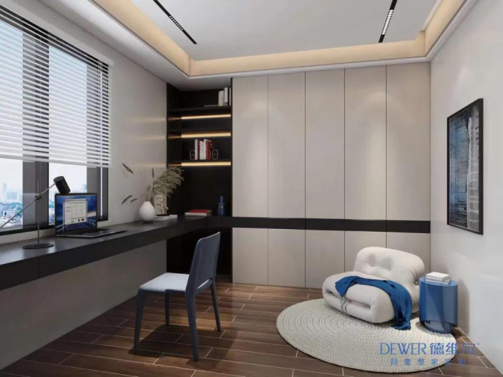 一个安静的环境能形成良好的学习氛围,所以书房必须使用隔音材料或者隔音效果好的门窗,也可以使用地毯等软装起到隔音的效果,这样就能心无旁骛地徜徉在知识的海洋里啦~