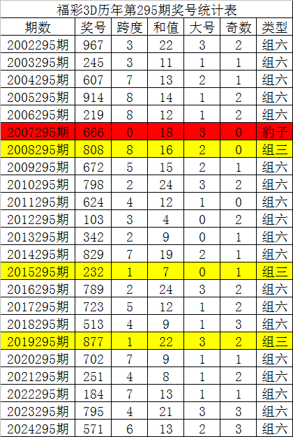 福彩3D历年第295期同期分别开出奖号:967、245、607、914、219、666、808、672、798、624、103、342、829、232、789、723、513、877、702、251、184、795、571,详细统计见下表: