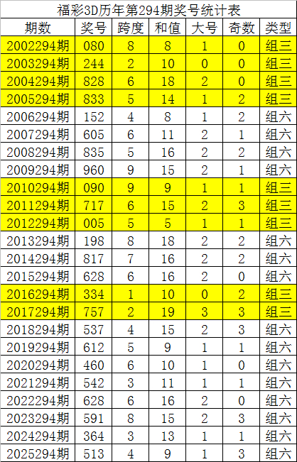 从以上统计可以看出,历年3D第295期开出了1次豹子号码,开出了3次组三号码,开出了19次组六号码。组六号码出现概率大,本期预计开出组六号码。