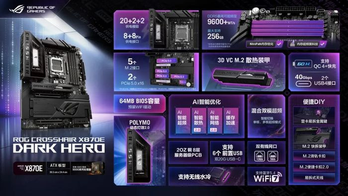 ROG CROSSHAIR X870E DARK HERO采用经典黑配色,加上Polymo动态灯效2.0,尽显低调奢华。采用20(110A)+2(110A)+2供电模组,同样有2盎司铜8层AI服务器级PCB、AI智能超频、混合双模超频以及AI缓存加速,可充分发挥性能。