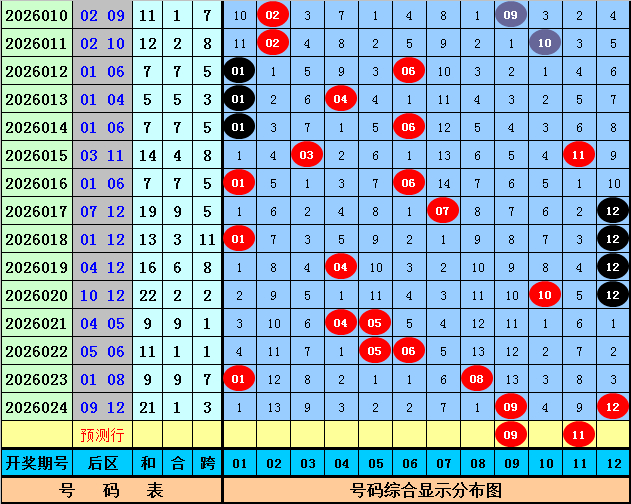 后区分析:后区上期开出号码09和12,分别遗漏13期和3期,目前后区01-12区间冷温热号码个数比为1:4:7,本期后区注意号码09+11。