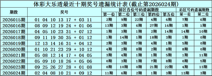 第2026024期奖号:02 04 08 10 21 + 09 12 ,各位号码遗漏期数为:11期、6期、2期、1期、3期 + 13期、3期。