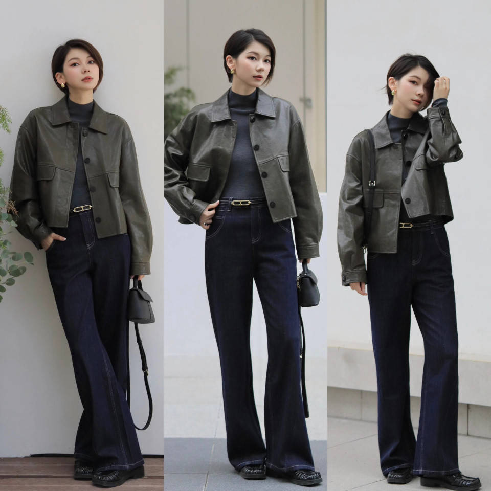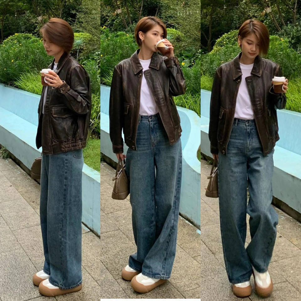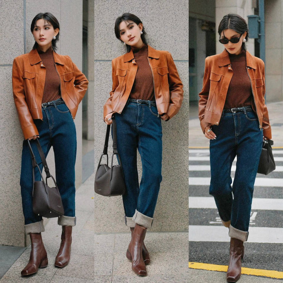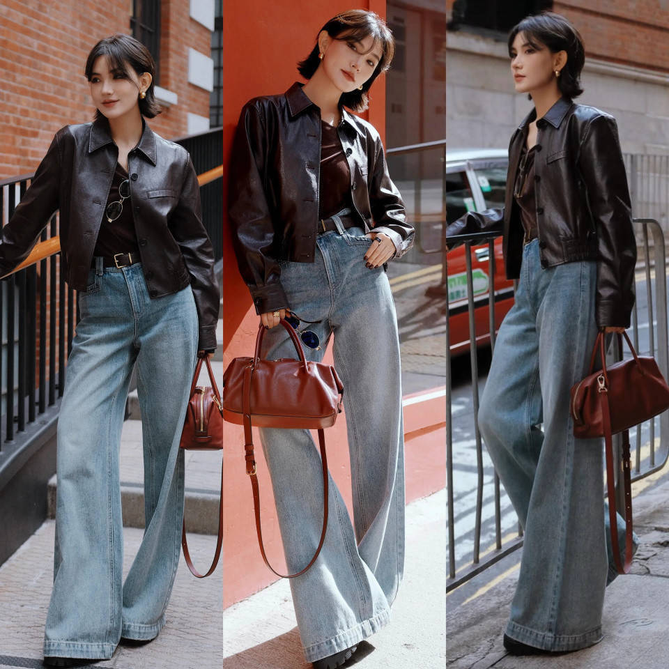 第一章节:想要把它皮衣穿出高级质感,全都藏在细节里搭配方案①:棕色皮衣+蓝色牛仔直筒阔腿裤
