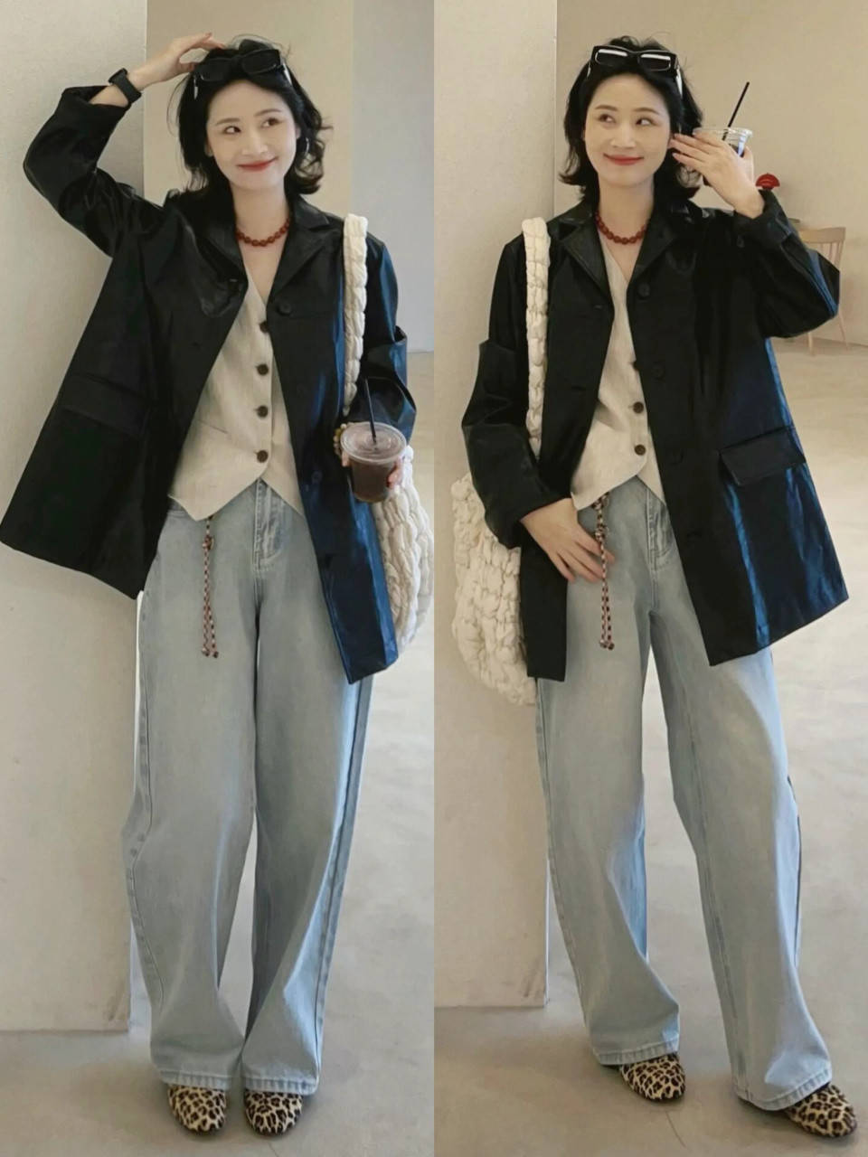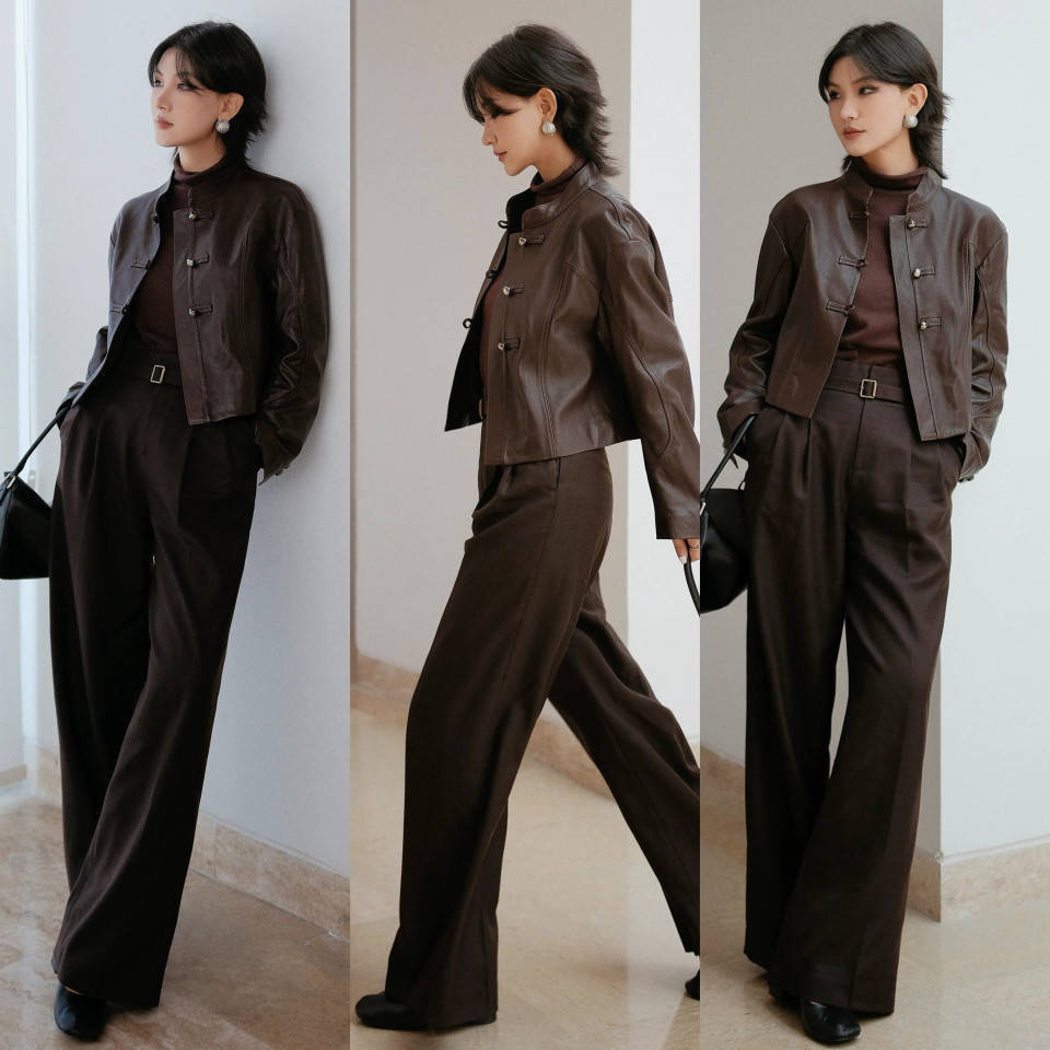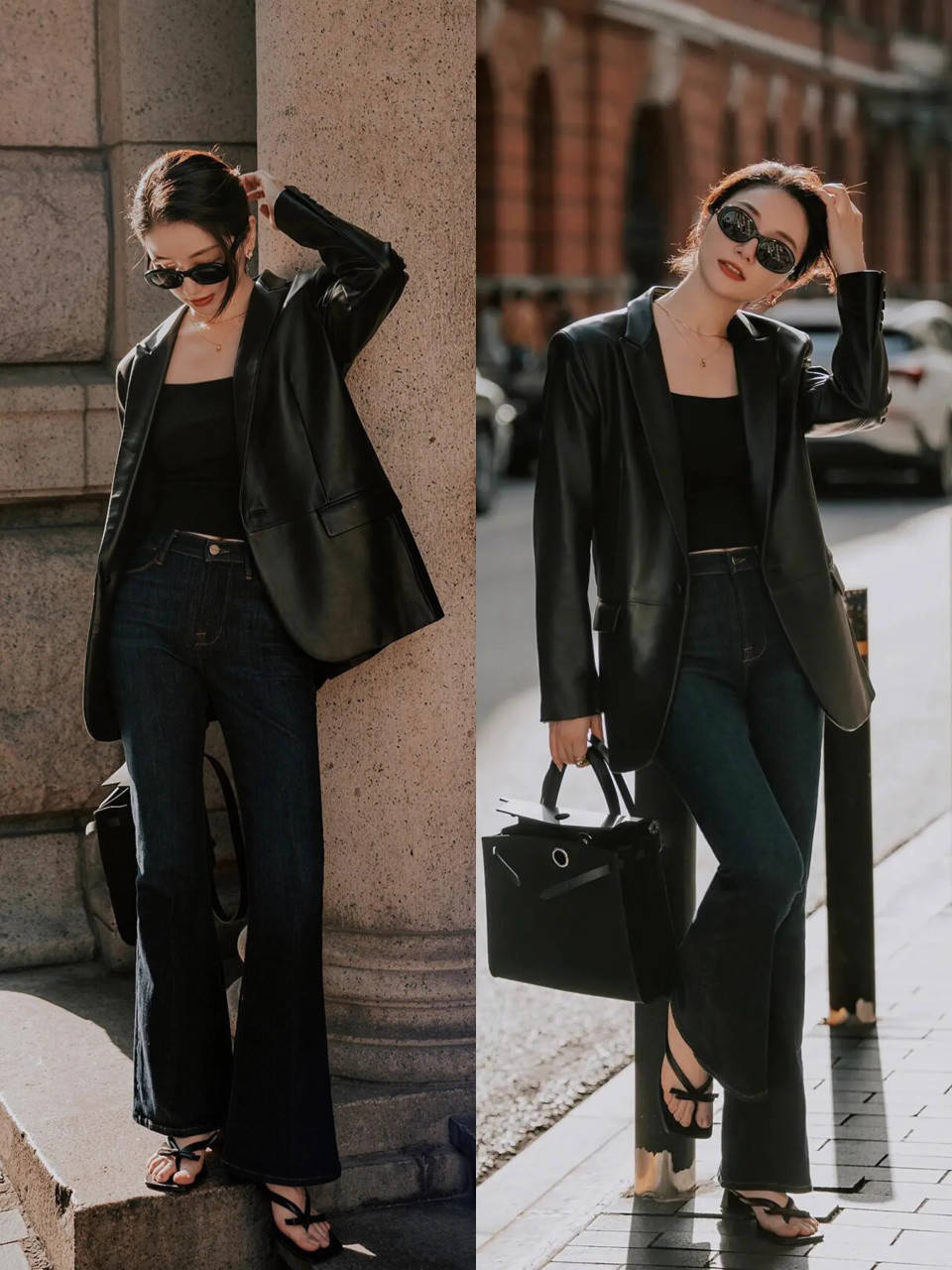 第一章节:想要把它皮衣穿出高级质感,全都藏在细节里搭配方案①:棕色皮衣+蓝色牛仔直筒阔腿裤