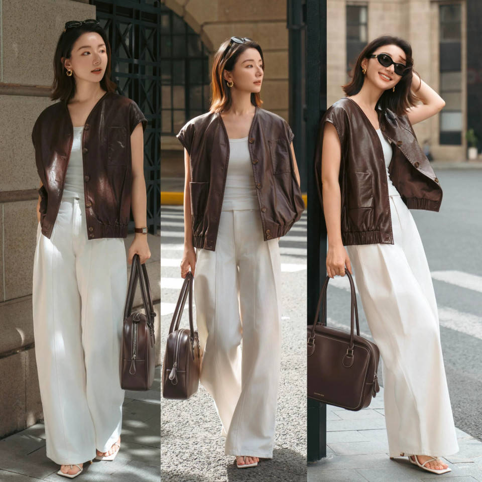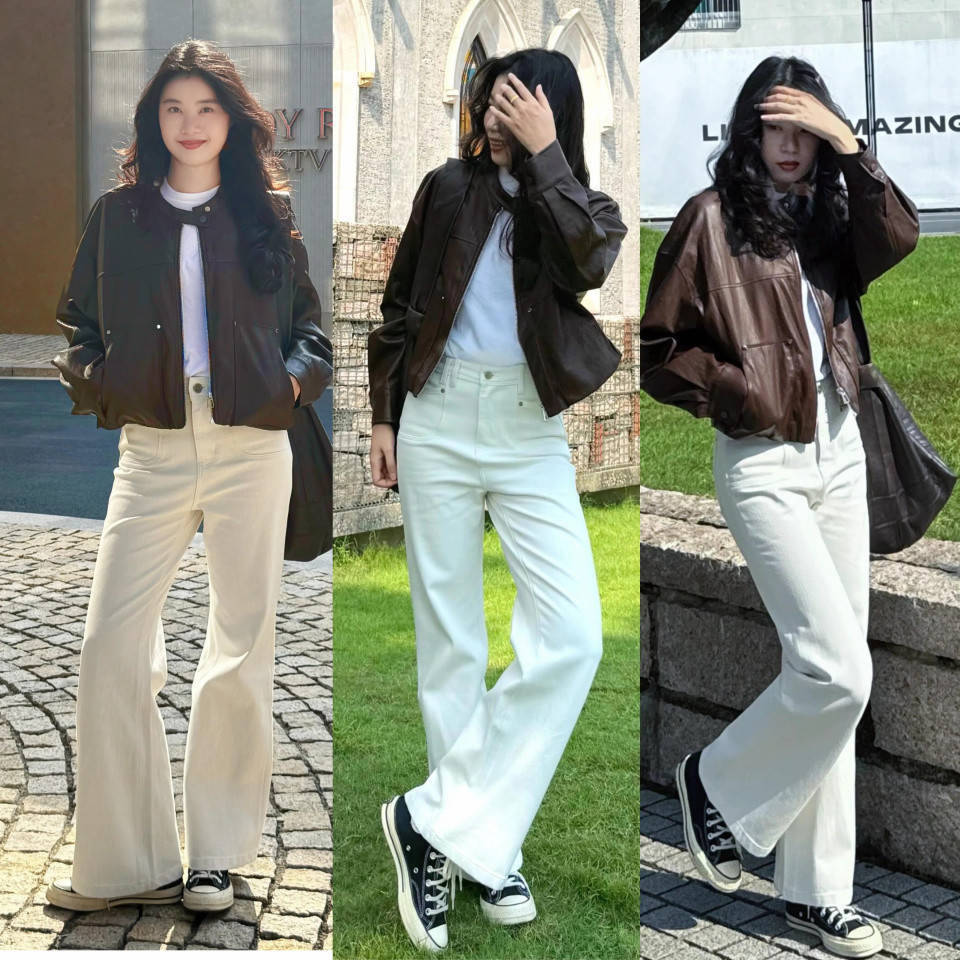 若想提升自己的穿衣造型,从通勤上班到周末出街,或是和闺蜜约下午茶,一件皮外套配上白色的牛仔直筒裤,内搭白 T 恤,脚踩一双帆布鞋,就能呈现出简约的街头风,百搭耐看不挑人,还显年轻。