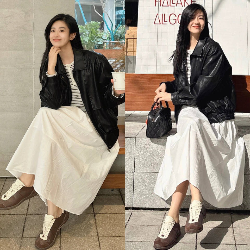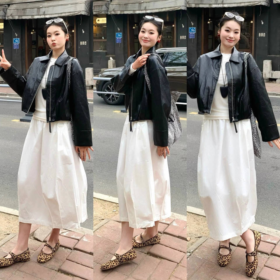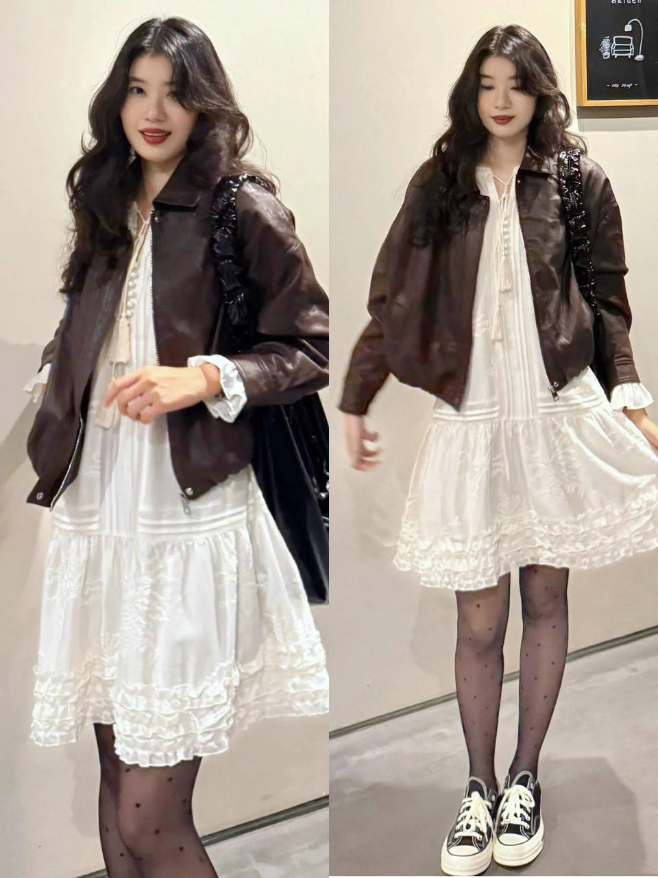 小个子女生长相偏甜美,这时可以选择棕色皮衣搭配一条白色的连衣裙,脚上穿了一双帆布鞋,外短内长的穿搭也能很好地形成高腰线,而且内搭的这条白色裙子有着甜美的少女元素,穿在身上可盐可甜。