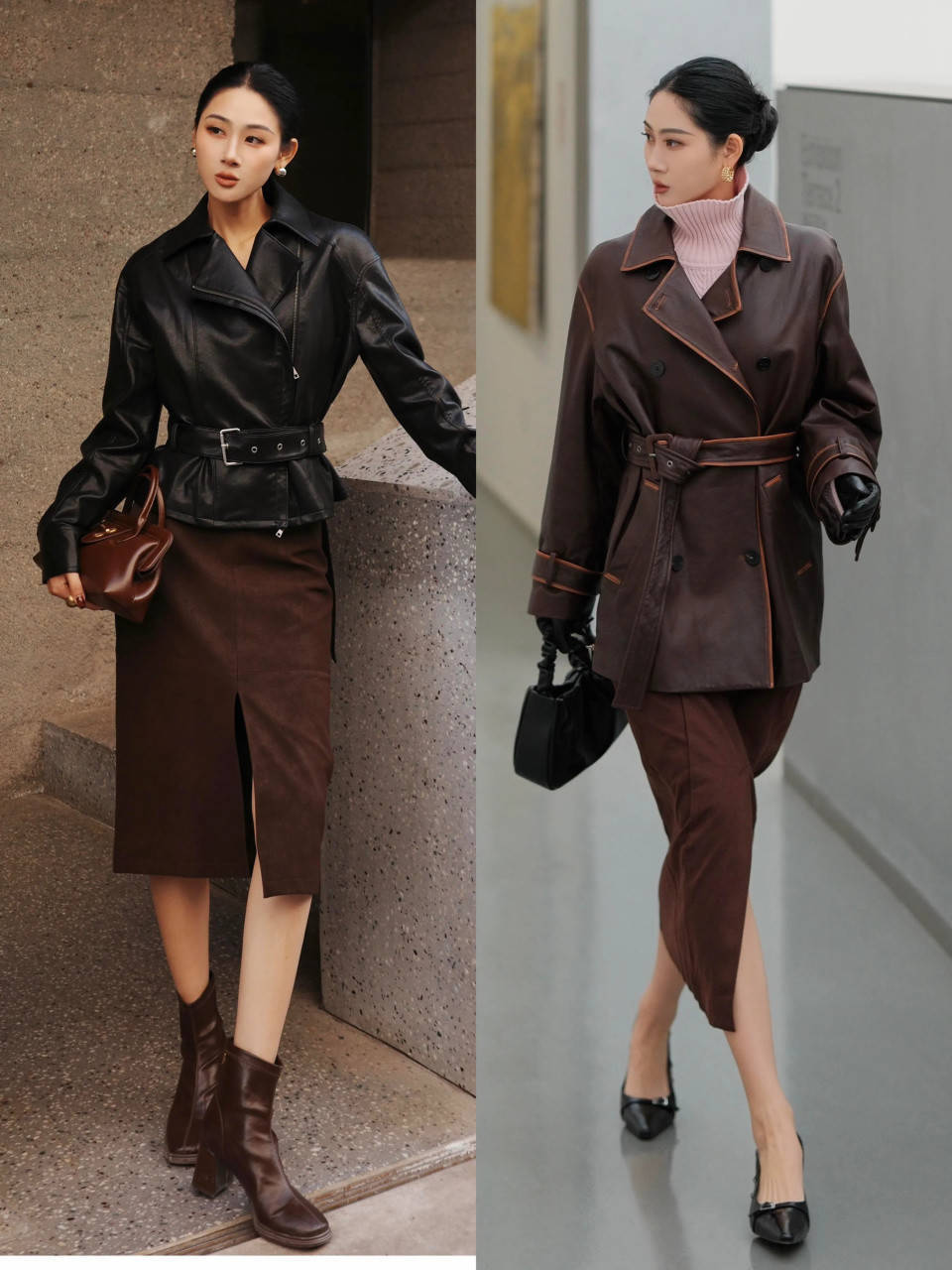 例如用一件黑色皮衣,或是棕色皮衣配上棕色直筒半裙,脚踩棕色短靴和浅口单鞋。就凭借着硬朗的线条感,让你走起路来自带风。
