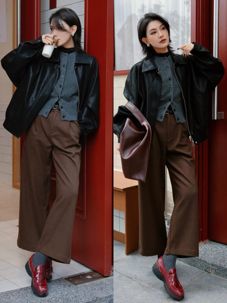 要是偏爱沉稳又有高级感的穿搭,可选一件黑色皮衣,内搭灰色针织开衫,叠穿黑色打底衫,下装是一条棕色西装九分裤,形成撞色搭配,层次感更分明。