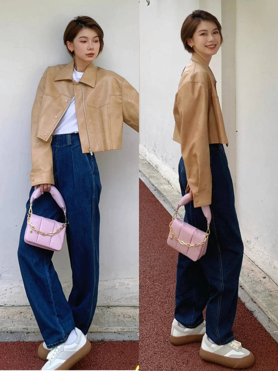 咱们也可以选择一双德系鞋,配上蓝色牛仔直筒裤和一件卡其色的短皮衣外套,内搭白色 T 恤,瞬间增添几分休闲感与活力感。整套穿搭又酷又美,让咱们普通素人也能轻松拿捏春日的酷感。