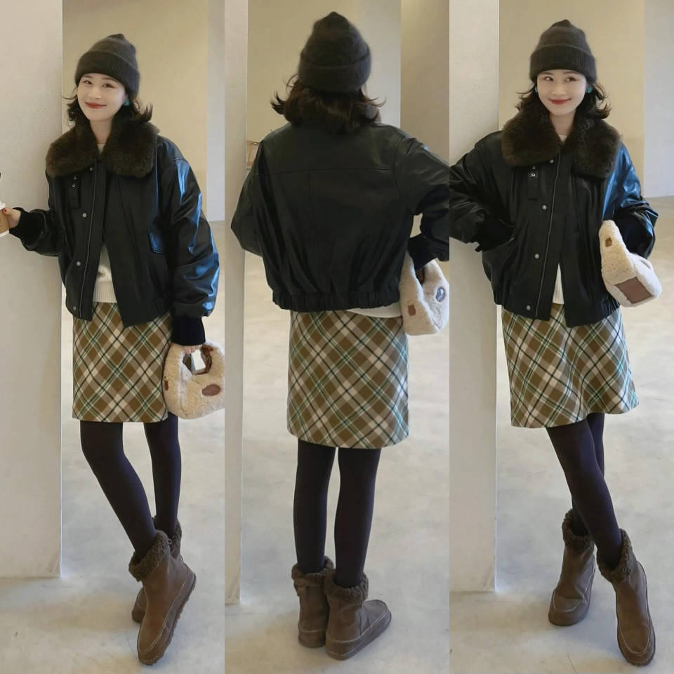在北方城市,天气还有点凉,并不像南方那么暖和,这时候你也想穿皮衣外套,不妨用毛领的皮衣内搭针织衫和一条格纹的直筒短裙,内搭保暖打底裤,脚上再踩着一双雪地靴,这样的穿衣造型既保暖又帅气。