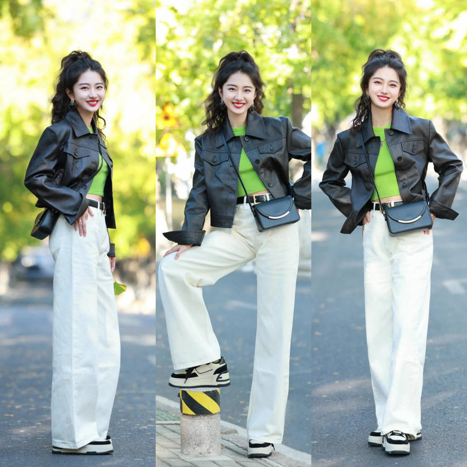 第二章节,春日穿皮衣+裤子的新搭配思路解析Tips①:皮衣配白色牛仔裤,休闲感十足